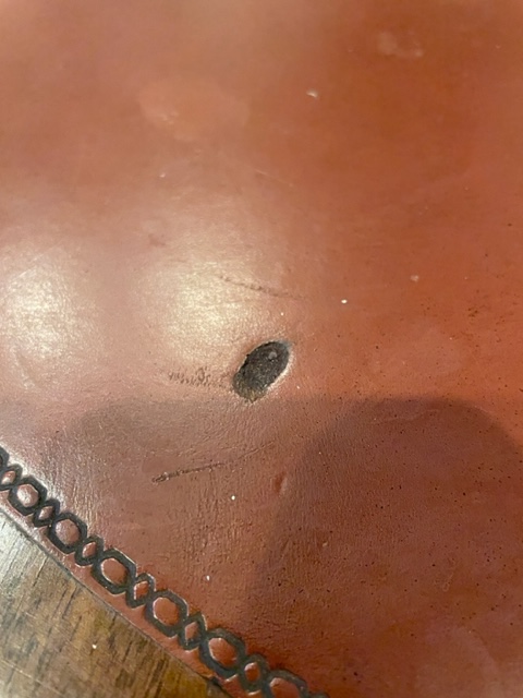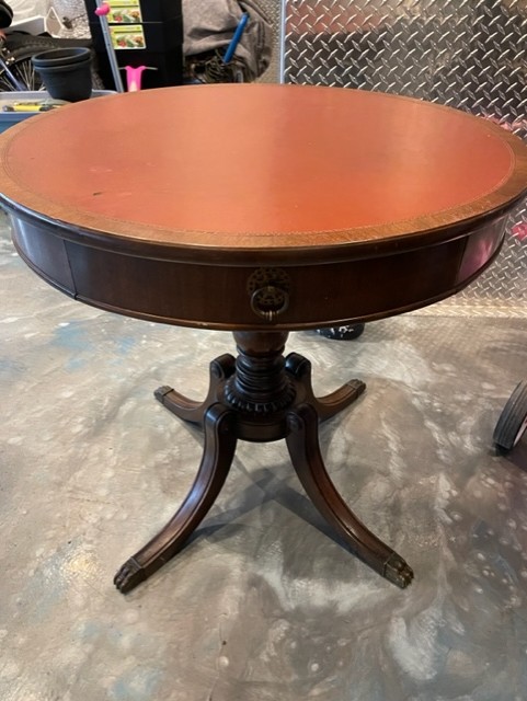 I found this traditional style table online, and started negotiating the price. Once we agreed on price and i picked it up, immediately, i was met with the stench of cigarette smoke that was deeply imbedded into this piece that had so much more life in my mind. The burn into the leather top, almost seemed to amplify the smell and confirmed what my nose could not ignore. Luckily, i was using left over materials to do this project, and i knew i had left over sealant to kill the smell.